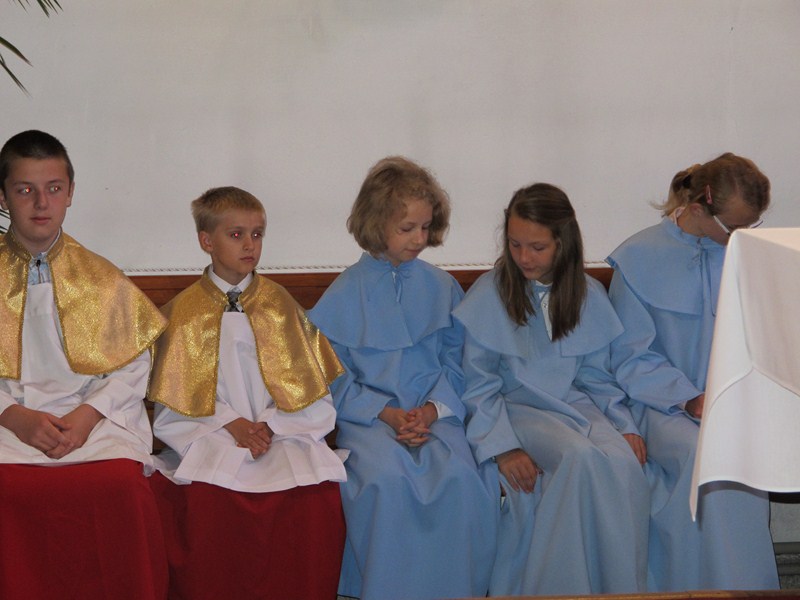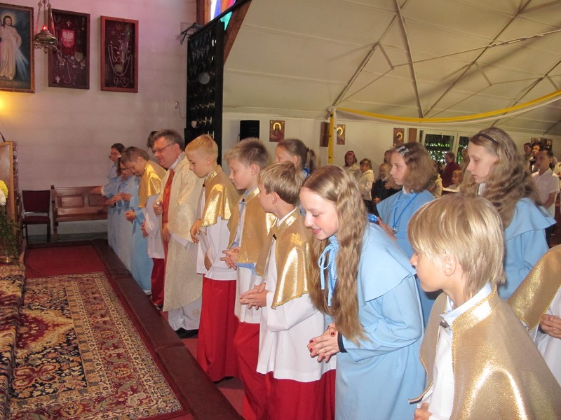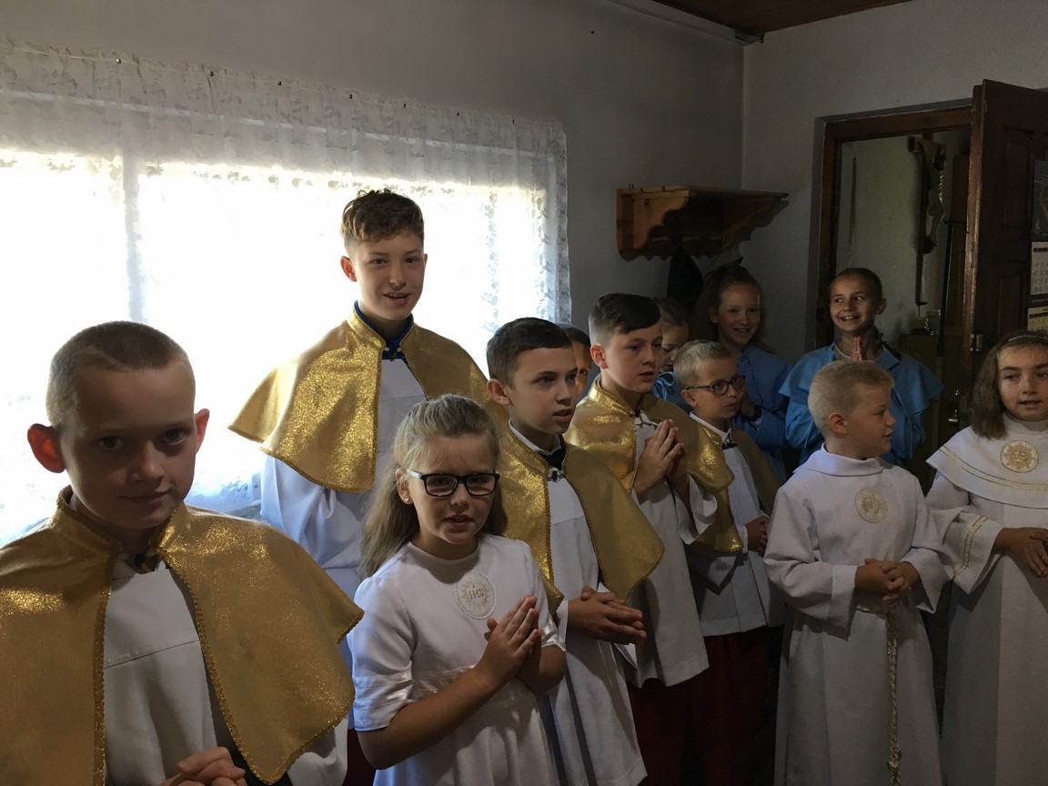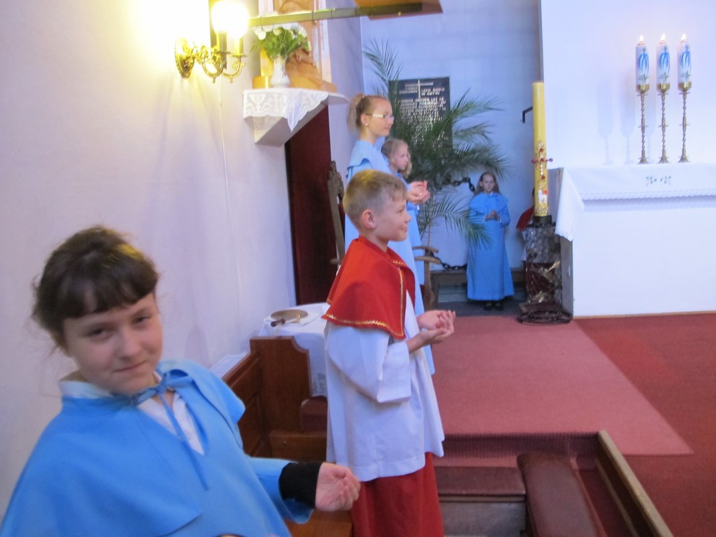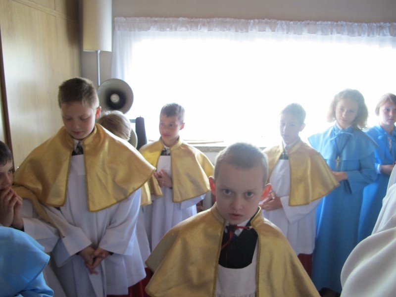- przygotowanie do Pierwszej Komunii rozpoczynamy od procesji Bożego Ciała rok przed Komunią - dziewczynki sypią kwiatki przed Panem Jezusem a chłopcy niosą symbol modlitwy Różaniec procesyjny.Rodzice dzieci klas drugich sprzątają kościół przed tegoroczną Komunią.