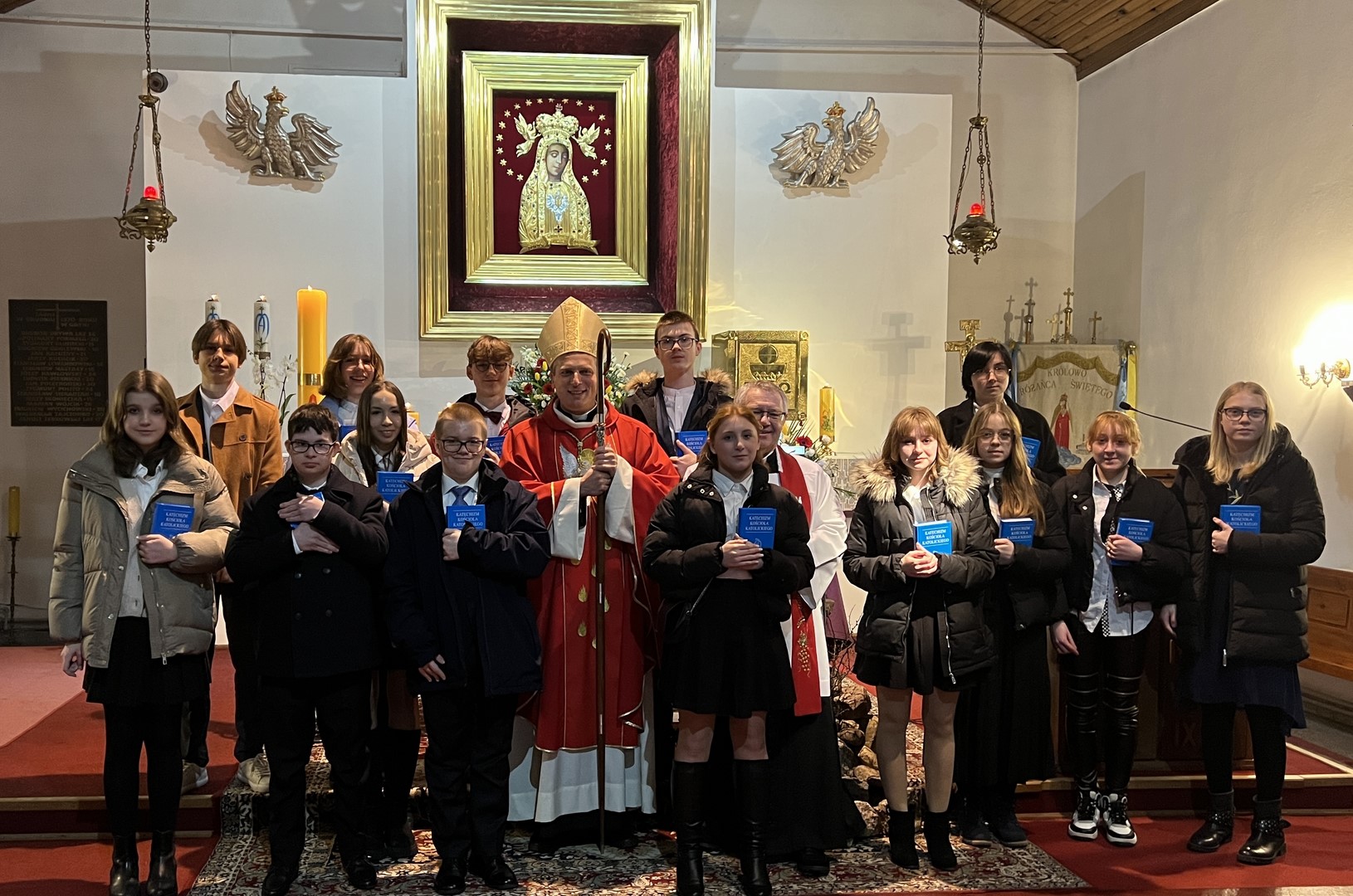 - Młodzież, rodzina, ks.Proboszcz – prosi o poświęcenie katechizmów. (ołtarz modlitwa poświęcenia )
